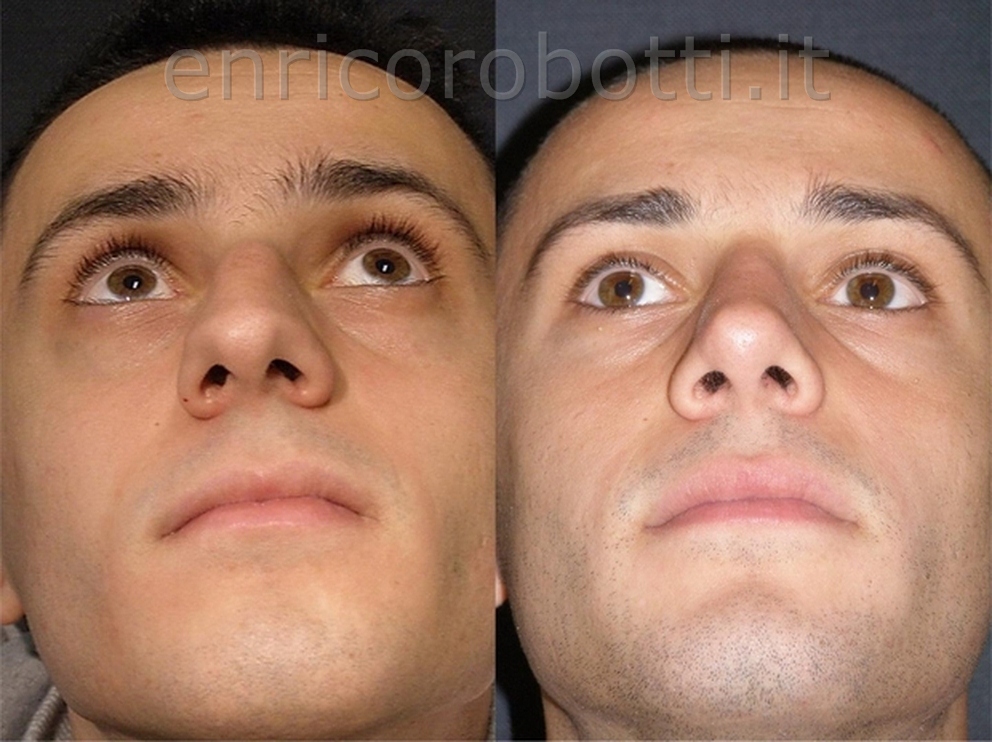 In this young man, the dorsum is wide and the tip is markedly deformed, with alar cartilages that are excessively wide, bulbous, convex, asymmetric, and rotated too far upward relative to the nostril margin. In addition, in profile and in the three-quarter view, the nose appears excessively projected. In this case, the surgical plan consists of narrowing the dorsum as appropriate through precise osteotomies of the nasal bones, deprojecting the tip, and, above all, restoring symmetry and harmony to the tip by combining selective resection of the superior border of the alar cartilages, downward repositioning of the alar cartilages, targeted sutures, and the use of thin, selective grafts (harvested from the septum) placed on the internal surface of those same cartilages. Surgery for a tip of this type is particularly sophisticated and requires a combination of several techniques, in addition, of course, to the open approach.