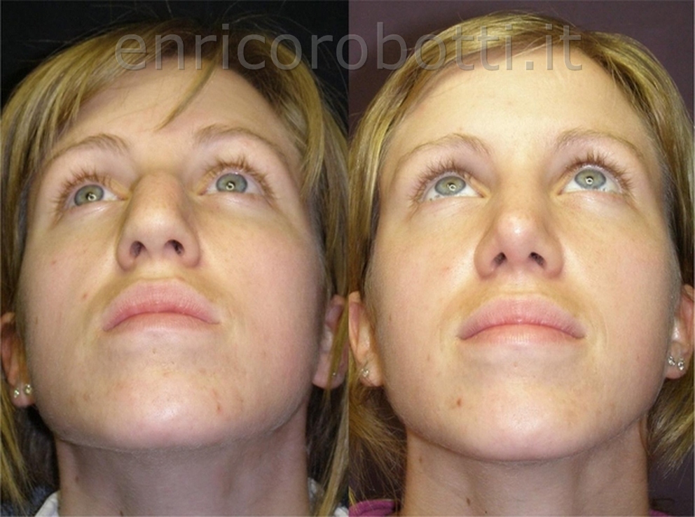 In this young woman, the nose is wide and deviated. The excessive width is primarily due to the nasal bones, which are too strong and overly separated. The deviation is both bony and cartilaginous, meaning it is caused by asymmetrical nasal bones and also (and mainly) by the nasal septum, which deviates to the right beginning at the point where the nasal bones end. Furthermore, the tip is rather bulbous and, above all, poorly supported. This becomes particularly evident when the patient smiles. If one were to treat only the dorsal hump (as might seem logical after a superficial assessment), the tip would droop even further downward, because it would lose the compensatory element that partially supports it—namely, the hump itself.