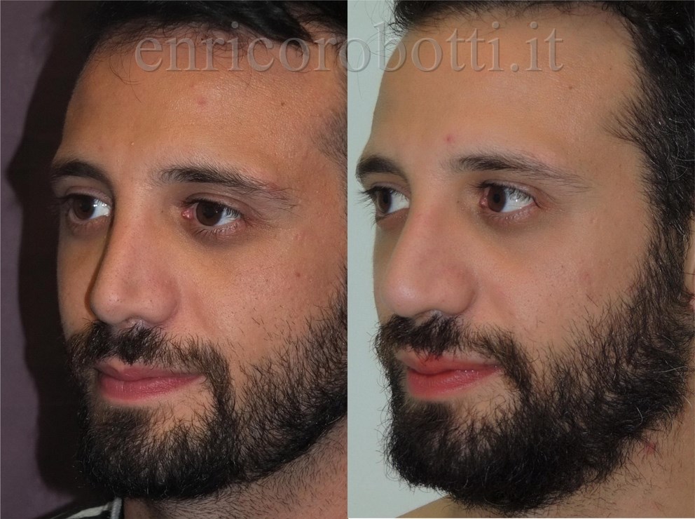 This patient has undergone three previous procedures, including septoplasty. He essentially complains of a “destructured” nose, with a pinched tip (and inspiratory breathing difficulty) and a mild saddle deformity of the dorsum, with a certain feminization of the profile. Given the lack of sufficient material available from the septum, the procedure required harvesting a costal segment to restore the agreed dorsal height and correct the pinched tip, in addition to the use of DCF (Diced Cartilage in Fascia) to restore a slight convexity to the profile, giving back the distinctly masculine characteristics strongly desired by the patient.